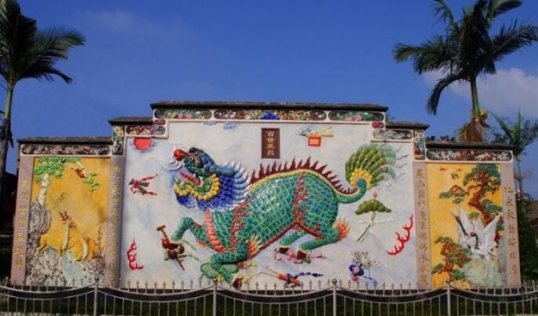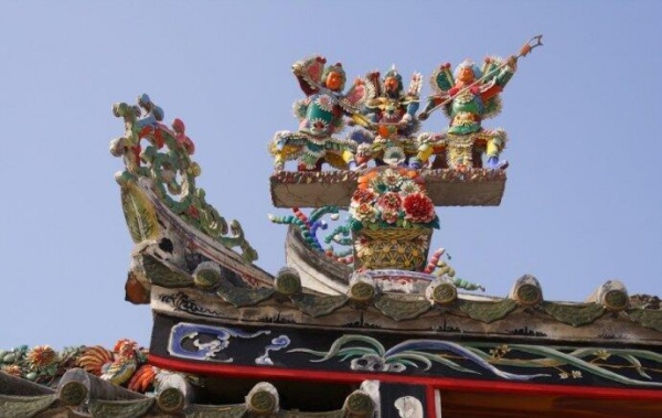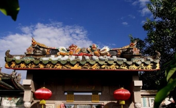 3、中脊和嵌瓷。民居中的中脊可分為高、中、低脊。一般后大廳頂為高脊,前廳為中脊,次房或花巷厝為低脊,厝頭的順延方向?yàn)榇箮А3鄙堑拇箮ж阮^、脊形式多樣,十分豐富。有的可與皇家的裝飾相媲美,因有潮汕嵌瓷的大量應(yīng)用于中脊和垂帶頭。形成了全世界獨(dú)一無(wú)二的屋頂裝飾獨(dú)特景觀(guān)。常見(jiàn)的有中脊通花嵌瓷、浮肚嵌瓷。神廟脊上龍鳳及百花百鳥(niǎo),瑞獸、吉祥圖案嵌瓷作品。是潮式建筑中的一道亮麗風(fēng)景線(xiàn)。嵌瓷工藝其用料做法是采用瓷碗、瓷盤(pán)敲碎后再經(jīng)修剪,然后再一片片、一條條對(duì)合泥胚進(jìn)行面層嵌貼。它因瓷質(zhì)瓷釉都要經(jīng)過(guò)高溫形成。所以嵌瓷作品形象生動(dòng),歷久而不變形不褪色,它是潮汕地區(qū)一種獨(dú)特的民族建筑裝飾工藝。