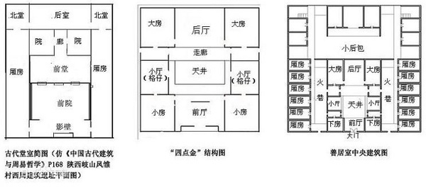 前廳--天井--后廳。后廳前廳兩側(cè)各一房,占居‘’四點金‘’的四角,這就是“四點金”名稱的由來。